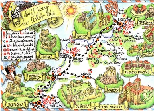 kaart met de tekst Podél Jizerny do Českého ráje (langs de Jizera naar het Boheems Paradijs).